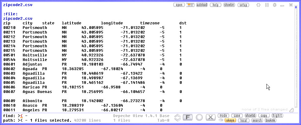 Example: viewing a CSV database of ZIP codes in Depeche View.