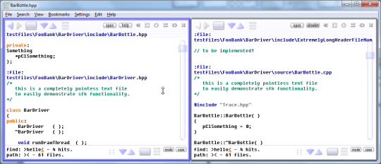 After download, run the tool by double click, then click on Open and select a directory from which you want to load all text files. All ASCII text files from that folder will be loaded, like all .txt, .ini, .html, readme or source code files. surfing the text Now, using CURSOR UP and DOWN or the MOUSEWHEEL is all nice, we've seen that in every editor. But now try this: - click anywhere into blank space, and keep the left mouse button pressed. - then move the mouse DOWN or UP. What you experience now is the Depeche View Text Surf. By default, when keeping the left mouse button pressed, dragging the mouse down moves the text up. This is similar to dragging a scrollbar in a classical windows application. If you want to drag the text in the same direction as your mouse move, check Setup / general / invert text surf direction. surfing two views in parallel If you have two views open, both pointing to similar text like two versions of a project, you can surf them both in parallel: - keep SHIFT pressed. - in the left side view, click anywhere into blank space, and keep the left mouse button pressed. - then move the mouse DOWN or UP. Both the left side view and it's nearby view will scroll. |