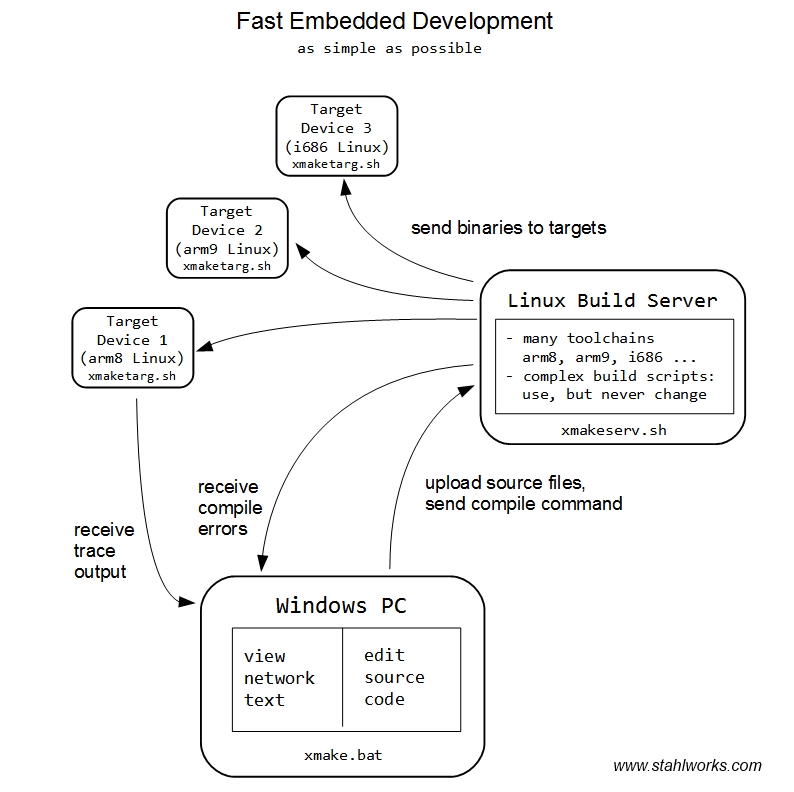 Fast Embedded Software Development with 4 small batch files for file transfer, remote compile, receive of compiler messages by network. no installation efforts, using a portable open source command line tool for Windows and Linux.