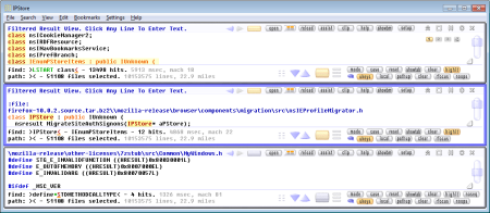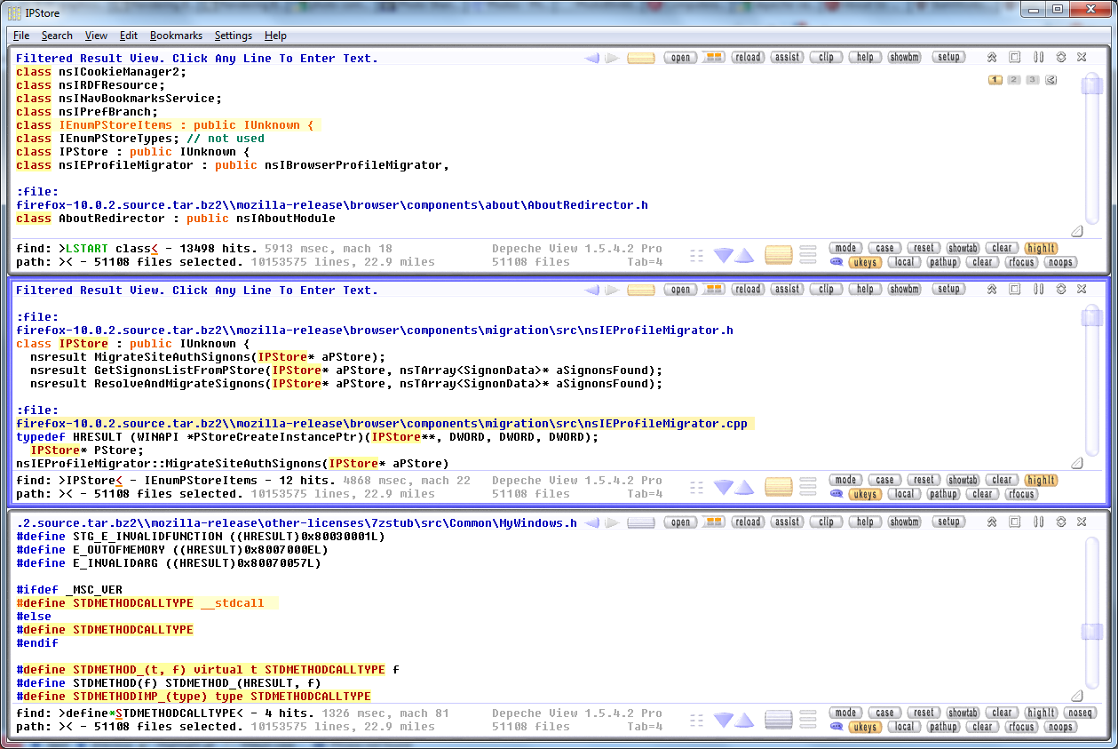 With Depeche View, a single SHIFT+click on a word searches it instantly, across all files, either in the current window, or in a second window (by a right button click). This allows realtime jumping through huge amounts of text, searching many different words in the shortest possible time.