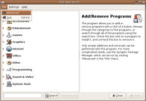 We enter the application installer in some kind of simple mode. It's actually a bit too simple - many packages don't seem to be available, so forget about this mode and select File / Advanced.