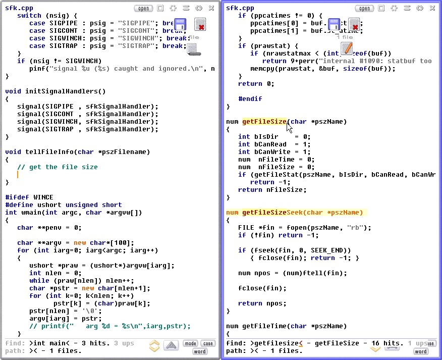 This allows to look up informations further down or up in the same file, or nearby files, while keeping a view onto the initial text position, e.g. to swiftly continue editing. Take a look at the example snapshot to the right: