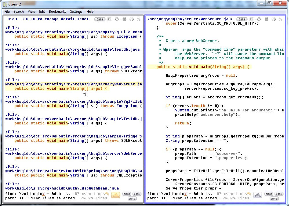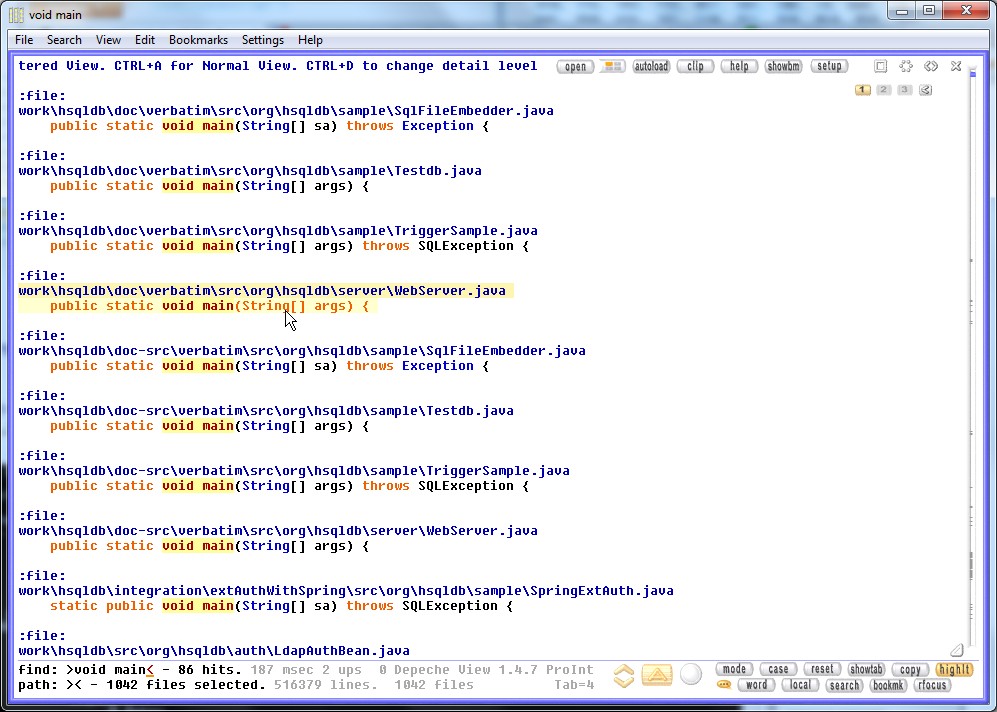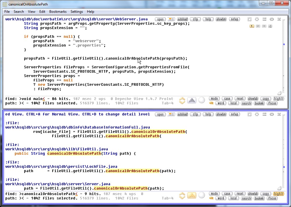 (*) Please note: the search time given above is an example and may vary by factors, depending on the hardware and search expression used. For example, longer words are found faster than shorter words, as they normally produce less results. Try it yourself. Get the Depeche View Pro Demo, load a Java project and fly over thousands of source code files. |