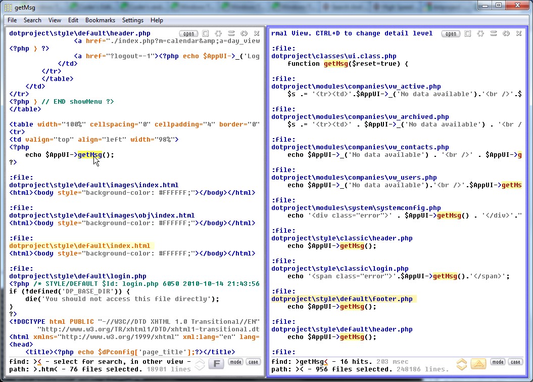 It loads all source files from a folder, showing them all in a single window, as if they were one large SuperText. Words are searched as you type, without the need to fill in any dialogues. Furthermore, words can be searched by simply clicking on them. Searches can be done in the current window, or - by a single right mouse click - in another window in parallel. This radical and simple usage concept allows high speed search and analysis within thousands of PHP, HTML, JavaScript and CSS source code files, tracking dependencies faster than with any other editor. Depeche View Pro comes with built-in syntax highlighting for PHP, HTML, JavaScript and CSS code. The highlighting can be adapted or extended through a configuration file with straightforward syntax. See an example here. |