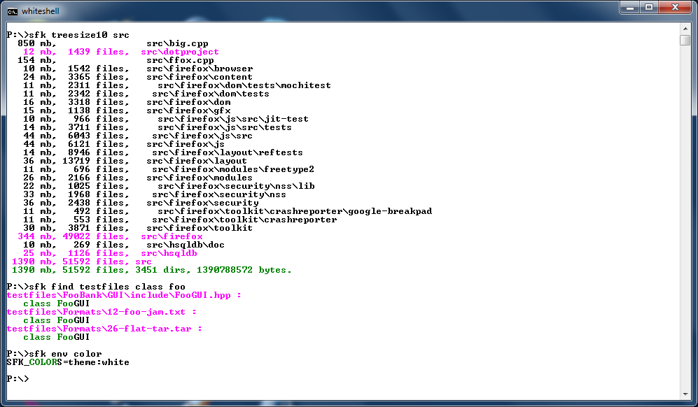 Now follows the SFK for Windows syntax overview. (On Mac OS X and Linux, replace every ! character by :, and every $ by #. Type wildcards with a preceeding slash: \* and \?) SFK - The Swiss File Knife Multi Function Tool. (w) by J Thumm 2006-2025, swissfileknife.sourceforge.net Release 2.0.0 Base/XD Revision 3 of Apr 12 2025. Distributed for free under the BSD License, without any warranty. type "sfk commandname" for help on any of the following. some commands require to add "-help" for the help text. file system sfk list - list directory tree contents. list latest, oldest or biggest files. list directory differences. list zip jar tar gz bz2 contents. sfk olist - list office files in a folder, like .docx .xlsx .ods .odt sfk filefind - find files by filename sfk treesize - show directory size statistics sfk copy - copy directory trees additively sfk sync - mirror tree content with deletion sfk rename - flexible multi file rename sfk partcopy - copy part from a file into another one sfk mkdir - create directory tree sfk delete - delete files and folders sfk deltree - delete whole directory tree sfk deblank - remove blanks in filenames sfk space [-h] - tell total and free size of volume sfk filetime - tell times of a file sfk touch - change times of a file sfk index - create index file(s) for fast lookup sfk name - lookup file names using index files sfk fixfile - change bad filenames and file times sfk setbytes - set bytes at offset within a file compression sfk zip - create zip file from folder sfk zipto - zip selected file list sfk unzip - list or extract zip file sfk checkzip - verify zip file content conversion sfk oload - load office file content as text sfk lf-to-crlf - convert from LF to CRLF line endings sfk crlf-to-lf - convert from CRLF to LF line endings sfk detab - convert TAB characters to spaces sfk entab - convert groups of spaces to TAB chars sfk scantab - list files containing TAB characters sfk split - split large files into smaller ones sfk join - join small files into a large one sfk csvtotab - convert .csv data to tab separated sfk tabtocsv - convert tab separated to .csv format sfk encode - convert data to base64 or hex format sfk decode - decode base64, hex or url format sfk wtoa - convert wide chars to Ansi sfk wtou - convert wide chars to UTF-8 sfk utoa - convert UTF-8 text to Ansi sfk hexdump - create hexdump from a binary file sfk hextobin - convert hex data to binary sfk hex - convert decimal number(s) to hex sfk dec - convert hex number(s) to decimal sfk chars - print chars for a list of codes sfk bin-to-src - convert binary to source code sfk uuencode - encode binary files as plain text sfk enmail -h - protect whitespace in email text text processing sfk filter - search, filter and replace text data sfk ofilter - filter text from an office file sfk replace - replace words in binary and text files sfk xed - edit stream text using sfk expressions sfk xex - extract from stream text using expressions sfk xreplace - replace in files using sfk expressions sfk run - run external command on all files of a folder sfk runloop - run a command n times in a loop sfk printloop - print some text many times sfk load - load file content for further processing sfk perline - run sfk command(s) per input text line sfk head - print first lines of a file sfk tail - print last lines of a file sfk snapto - join many text files into one file sfk addhead - insert string at start of text lines sfk addtail - append string at end of text lines sfk joinlines - join text lines split by email reformatting sfk strings - extract strings from a binary file sfk sort - sort text lines produced by another command sfk count - count text lines, filter identical lines sfk difflines - show text lines differing between files sfk linelen - tell length of string(s) search and compare sfk xfind - search in text files using wildcards and simple expressions sfk ofind - search in office files .docx .xlsx .ods sfk xfindbin - search in text and binary files sfk xhexfind - search with hexdump output sfk extract - extract data from text and binary sfk find - search static text, without wildcards sfk hexfind - search static binary data sfk md5gento - create list of md5 checksums over files sfk md5check - verify list of md5 checksums over files sfk md5 - calc md5 over a file, compare two files sfk pathfind - search PATH for location of a command sfk reflist - list fuzzy references between files sfk deplist - list fuzzy dependencies between files sfk dupfind - find duplicate files by content networking sfk httpserv - run an instant HTTP server. type "sfk httpserv -help" for help. sfk ftpserv - run an instant FTP server type "sfk ftpserv -help" for help. sfk ftp - instant FTP client sfk web - send HTTP request to a server sfk wget - download HTTP file from the web sfk tcpdump - print TCP conversation between programs sfk udpdump - print incoming UDP requests sfk udpsend - send UDP requests sfk webproxy - http proxy for traffic analysis sfk help tcp - tcp toolkit to write test scripts sfk ip - tell own machine's IP address(es). type "sfk ip -help" for help. sfk netlog - send text outputs to network, and/or file, and/or terminal sfk fromnet -h - receive and print network text sfk ping - ping multiple machines in one go sfk pingdiff - find ip of new devices scripting sfk help chain - how to combine multiple commands sfk batch - run many sfk commands in a script file sfk label - define starting points within a script sfk call - call a sub function at a label sfk echo - print (coloured) text to terminal sfk color - change text color of terminal sfk setvar - put text into an sfk variable sfk storetext - store text in memory for later use sfk alias - create command from other commands sfk mkcd - create command to reenter directory sfk sleep - delay execution for milliseconds sfk pause - wait for user input sfk stop - stop sfk script execution sfk tee - split command output in two streams sfk tofile - save command output to
